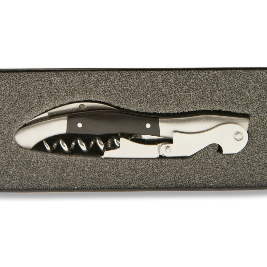 Oenophile kelnersmes van hoogwaardig RVS met een Ebbenhouten inleg. Deze wijnopener is ook verkrijgbaar in Rozenhout of Cocobola